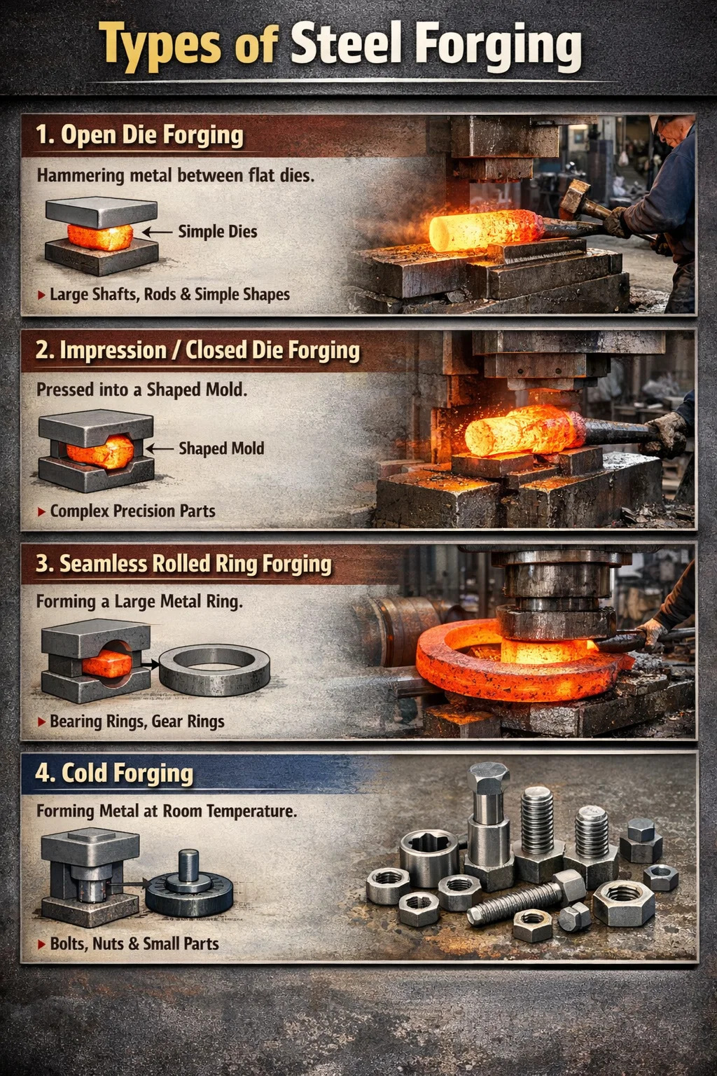 No campo do processamento de metais, existem muitos processos de forjamento diferentes. De acordo com o método de classificação mais comum, forjamento de aço geralmente pode ser dividido nas seguintes quatro categorias: