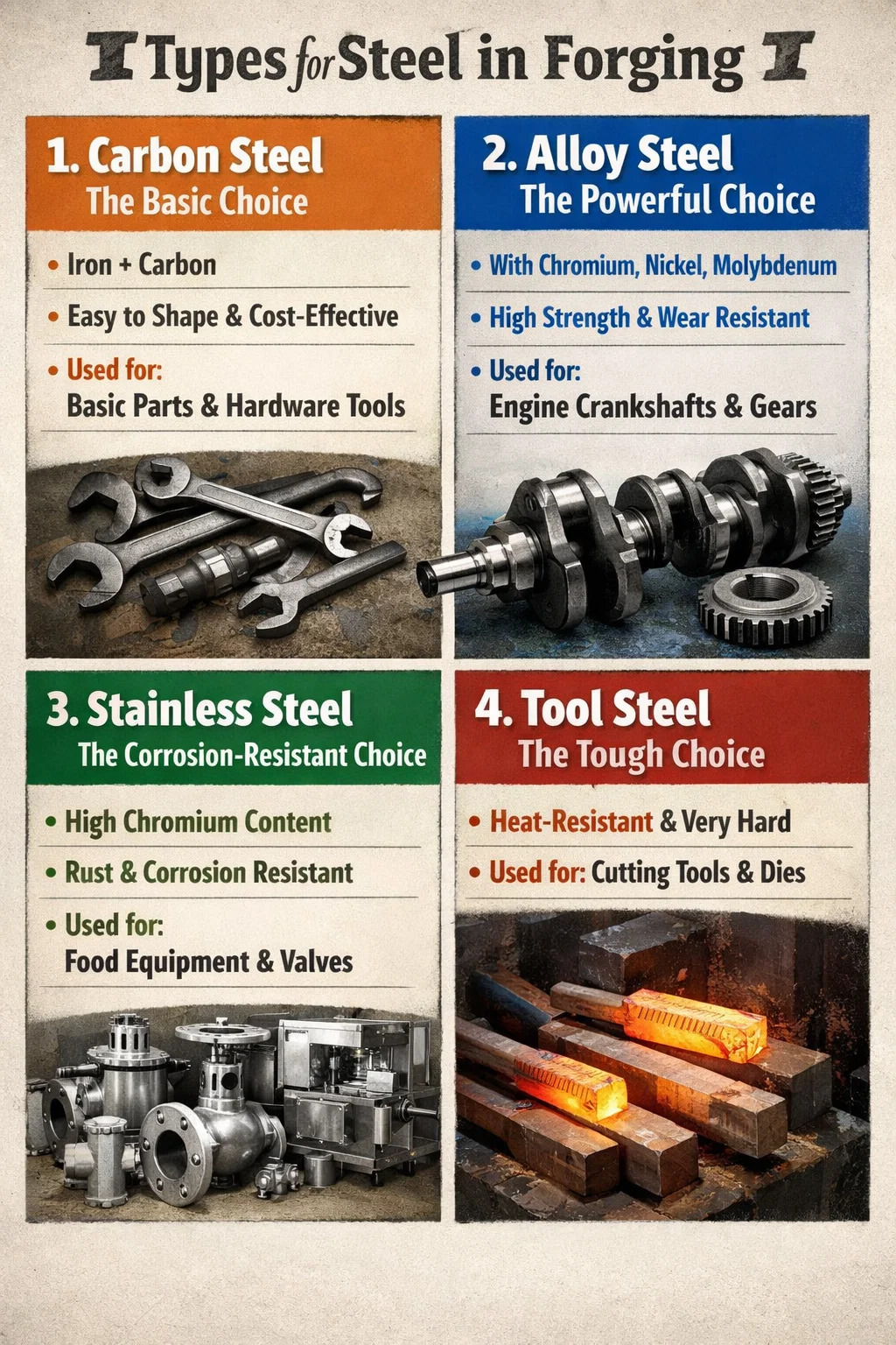 Na produção industrial real, nem todo aço é adequado para “aquecimento e martelamento”. Para garantir que as peças resultantes sejam fortes e duráveis, forjamento de aço normalmente usa os seguintes tipos principais de aço, dependendo da aplicação: